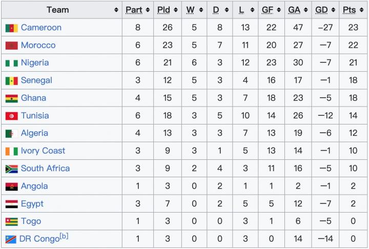其他球队也不甘示弱,塞内加尔队12场参赛收获5场胜利,加纳队15场参赛同样取得5场胜利,突尼斯队18场参赛赢得3场胜利,阿尔及利亚队13场参赛也有3场胜利入账,科特迪瓦队和南非队则分别以9场参赛3场胜利和9场参赛2场胜利的成绩紧随其后。而埃及队,虽然7场参赛却未能收获一场胜利。